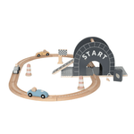 Incluye 3 coches, 2 conos, 1 bandera y 12 tramos de carretera. Fabricado con madera FSC. A partir de 2 años.