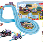 Circuito de 2,9m (montado 114cmx87,5cm) en escala reducida especialmente diseñado para niños de más de 3 años. Incluye coches de Bluey y Bingo y elementos decorativos. Funciona con pilas (no incluidas).