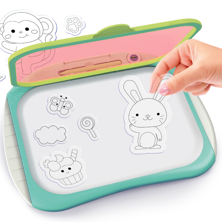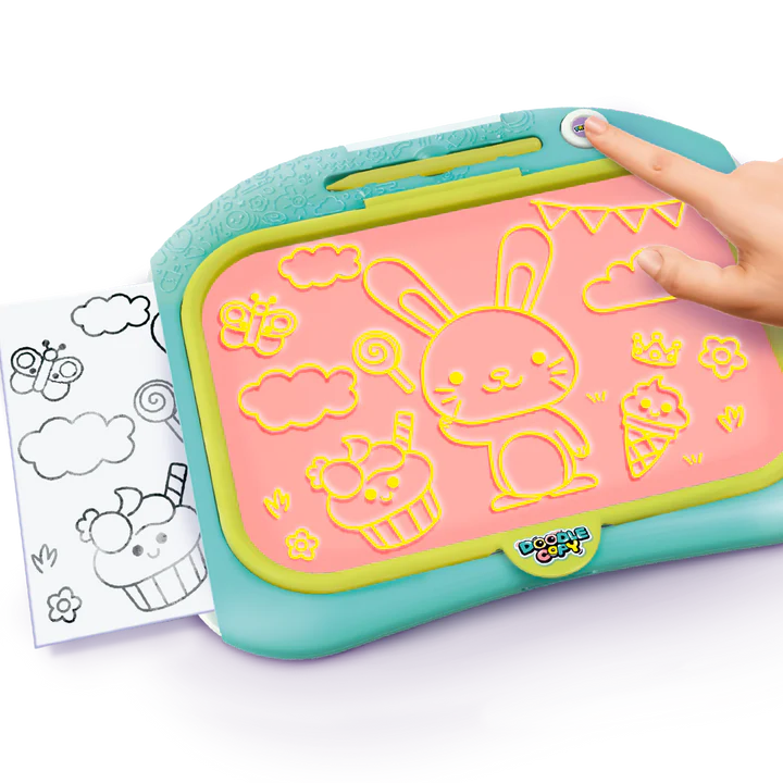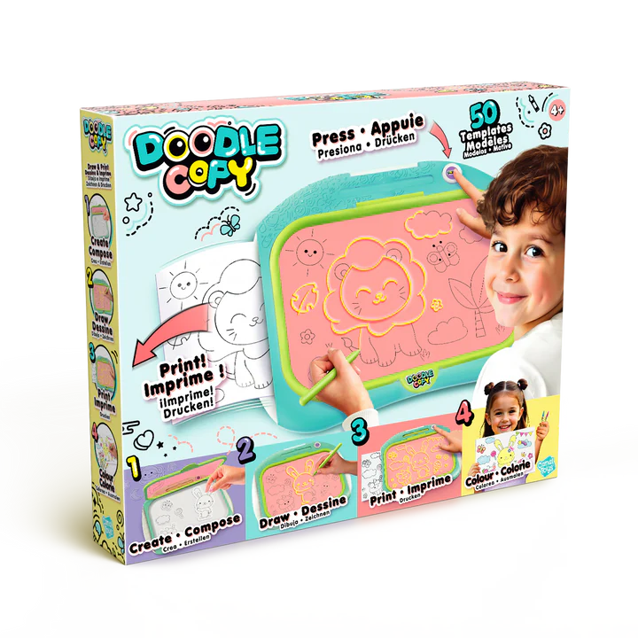 Descubre la Doodle Copy, ¡el juguete perfecto para aprender a dibujar! Sólo tienes que elegir una plantilla, colocarla en la máquina y calcarla. Una vez que hayas terminado, ¡pulsa el botón para imprimir tu dibujo! Sólo te queda colorearlo.