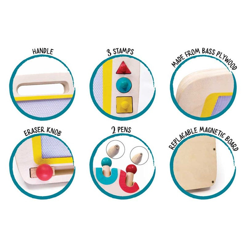 La superficie de madera ofrece estabilidad y una experiencia de dibujo única. El panel magnético es reemplazable, ya que la parte trasera de la pizarra se puede desmontar. Fabricada exclusivamente con madera de haya y contrachapado, con bordes afilados y colores no tóxicos para garantizar la seguridad de los niños. Su asa la hace duradera, ¡así que la puedes llevar a todas partes! ¡Prepárate para cautivar a tu público con tus hermosas y únicas creaciones!