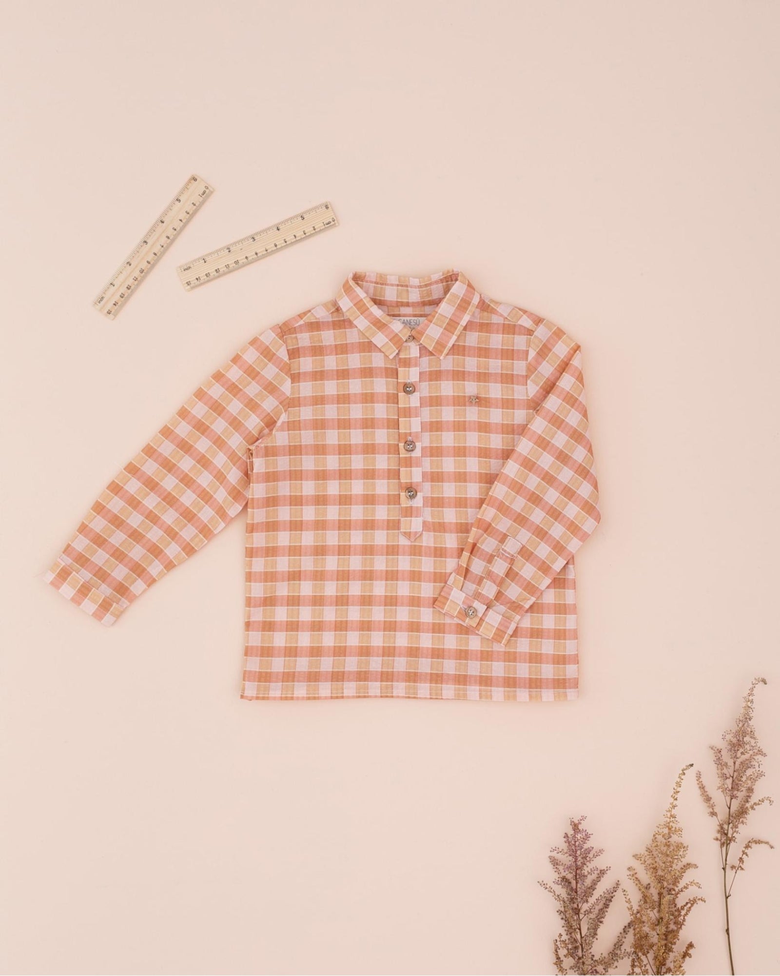 Camisa tipo polera en tejido Cuadro Caramelo. La tonalidad de este color la hace muy combinable con la mayoría de prendas de nuestra colección. Su cuello de pico es ideal para sacarlo y que asome con nuestros jerséis y joggings.