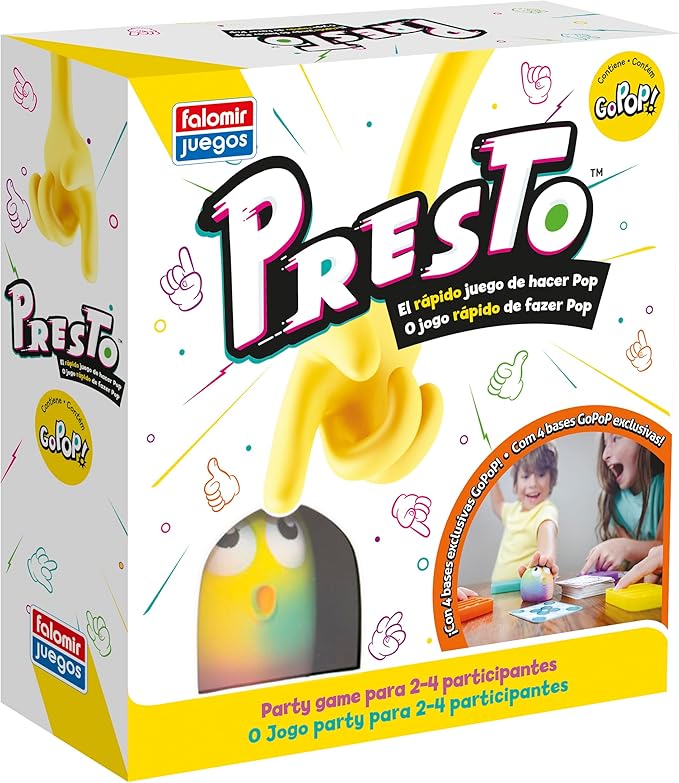 Un juego vibrante que mezcla habilidad y rapidez. Logra ser el primero en juntar 6 tarjetas Presto y celebra tu triunfo. Prepara tus dedos, agudiza tus reflejos y ¡prepárate para el POP!