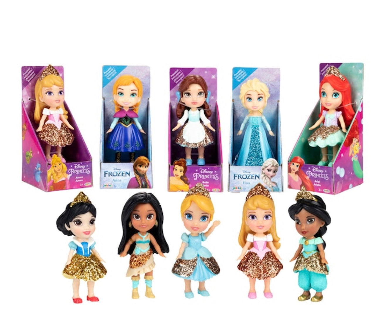 Mini muñecas de las Princesas Disney y Frozen, fabricadas en PVC. Permiten recrear historias y aventuras. Cada muñeca presenta un alto nivel de detalle y son articuladas. La colección incluye personajes como Ariel, Aurora, Bella, Cenicienta, Jasmine, Rapunzel, Mulan, Blancanieves, Tiana, Mérida, Pocahontas, Vaiana, así como versiones de Elsa y Anna en diferentes vestuarios, además de Kristoff, Sven y Olaf. Las muñecas se venden por separado y están disponibles según existencias.