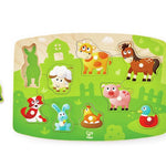 - El Puzle incluye un base con temática de granja colorida y nueve piezas de animales (burro, oveja, vaca, caballo, cerdo, perro, gallina, conejo y pato) con pinzas.