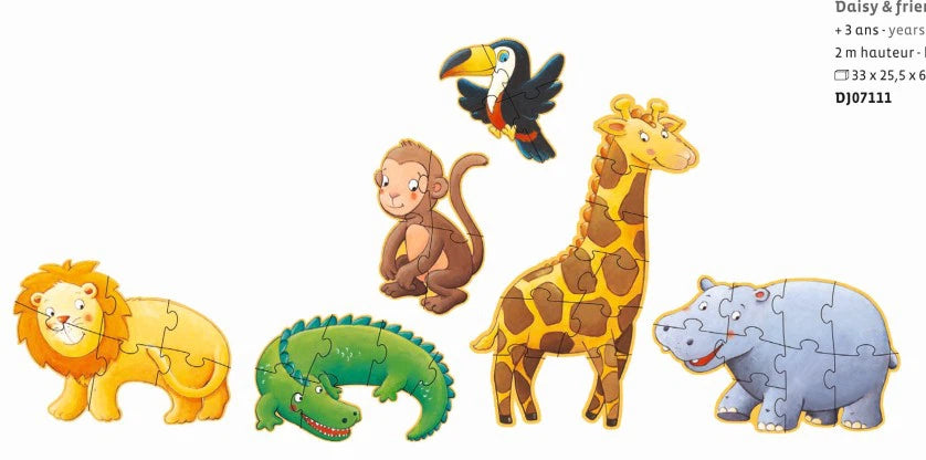 -«Ouistiti et ses amis» es un estuche que incluye 6 puzles gigantes evolutivos de siluetas de 4, 6 y 9 piezas. El niño reconstruye los distintos animales de la selva: loro, mono, león, cocodrilo, jirafa e hipopótamo. Después de montarlos, los superpone para crear una gran pirámide de 1,30 m.