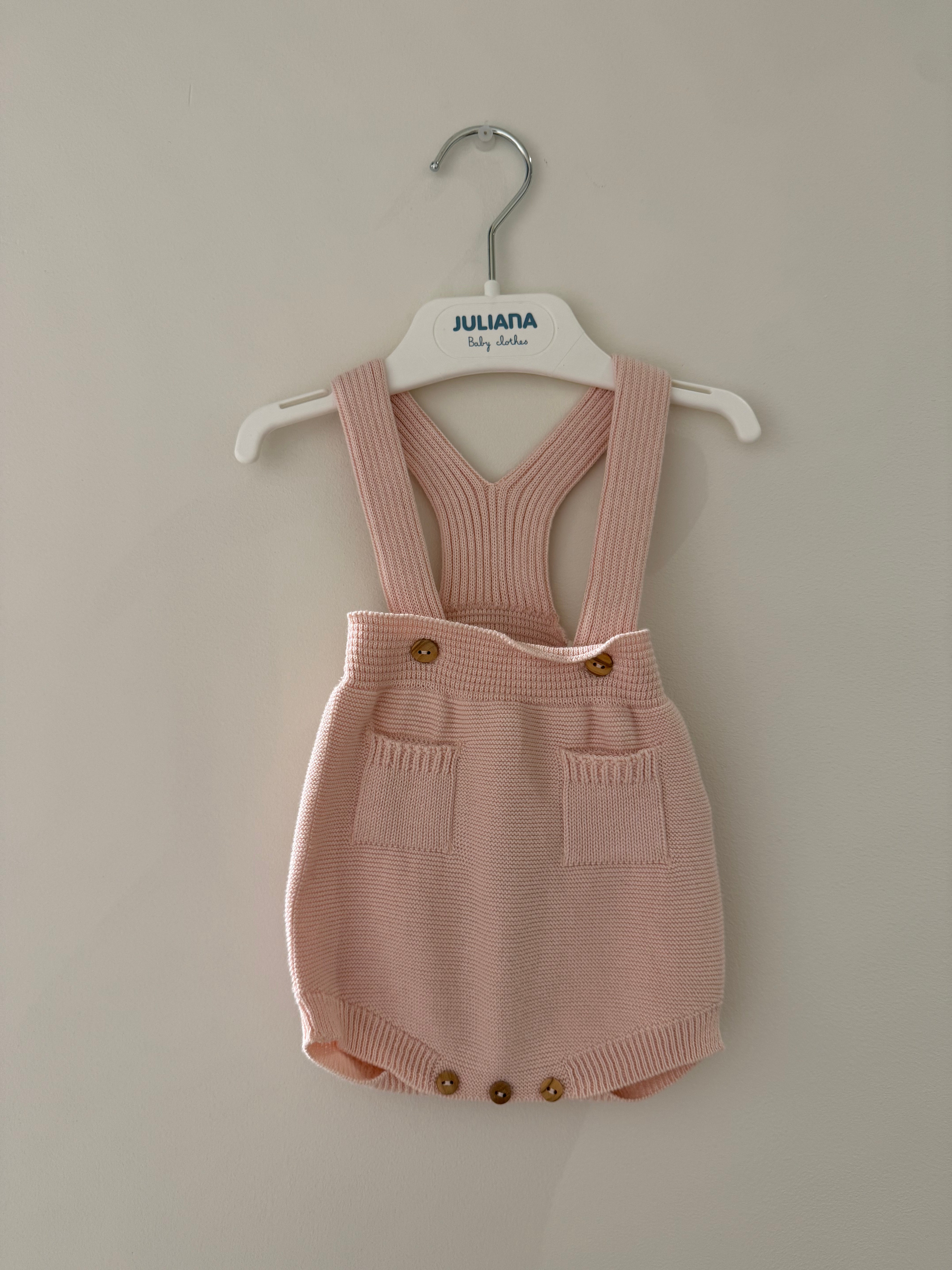 Ranita con tirantes tejido en malla fina de algodón orgánico suave y transpirable, ideal para bebés. Se cierra delante en los tirantes y entre las piernas con botones de madera. Una sola pieza sin costuras, para el máximo confort de tu bebé.