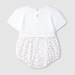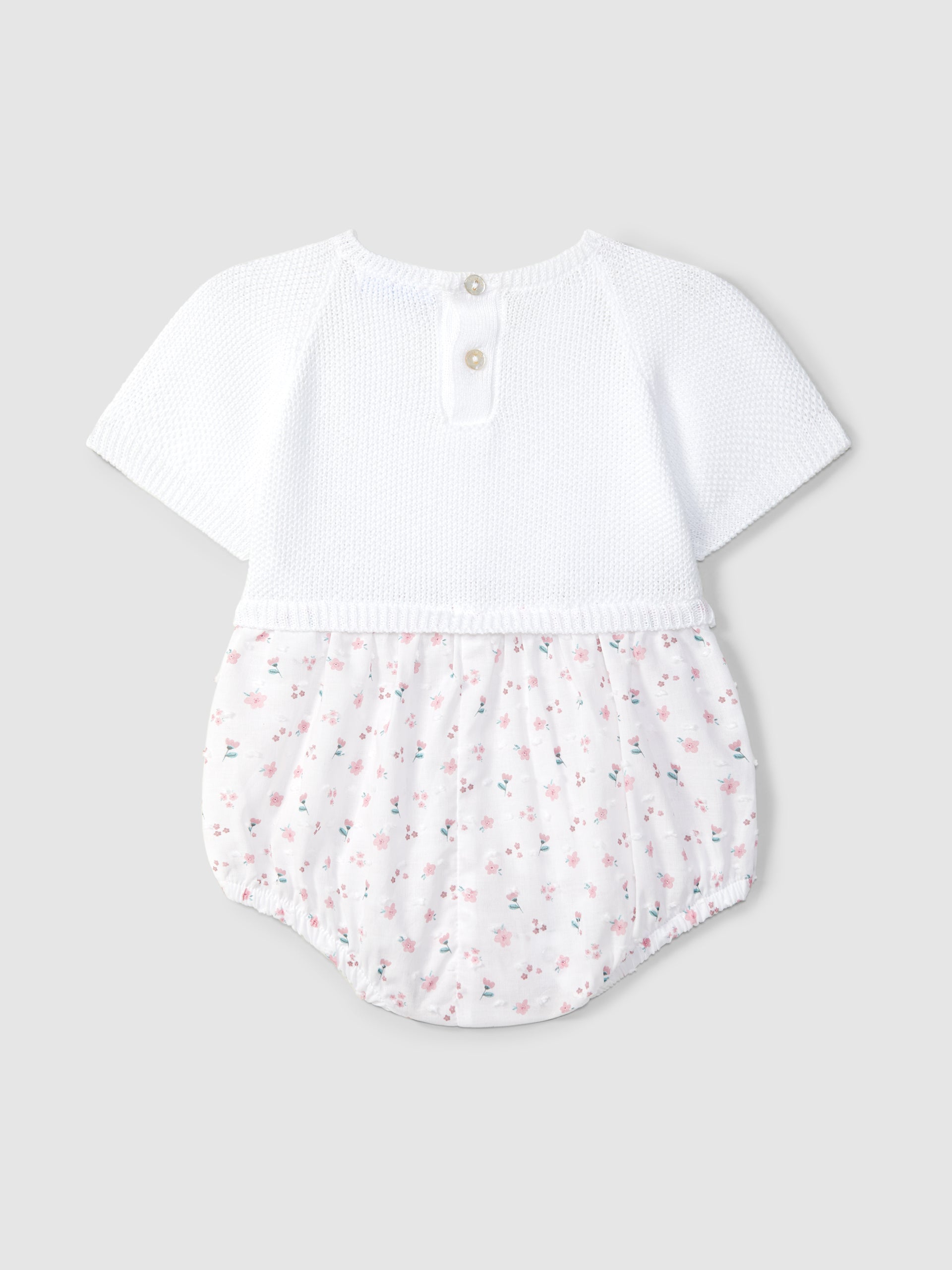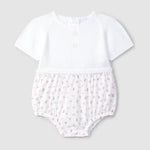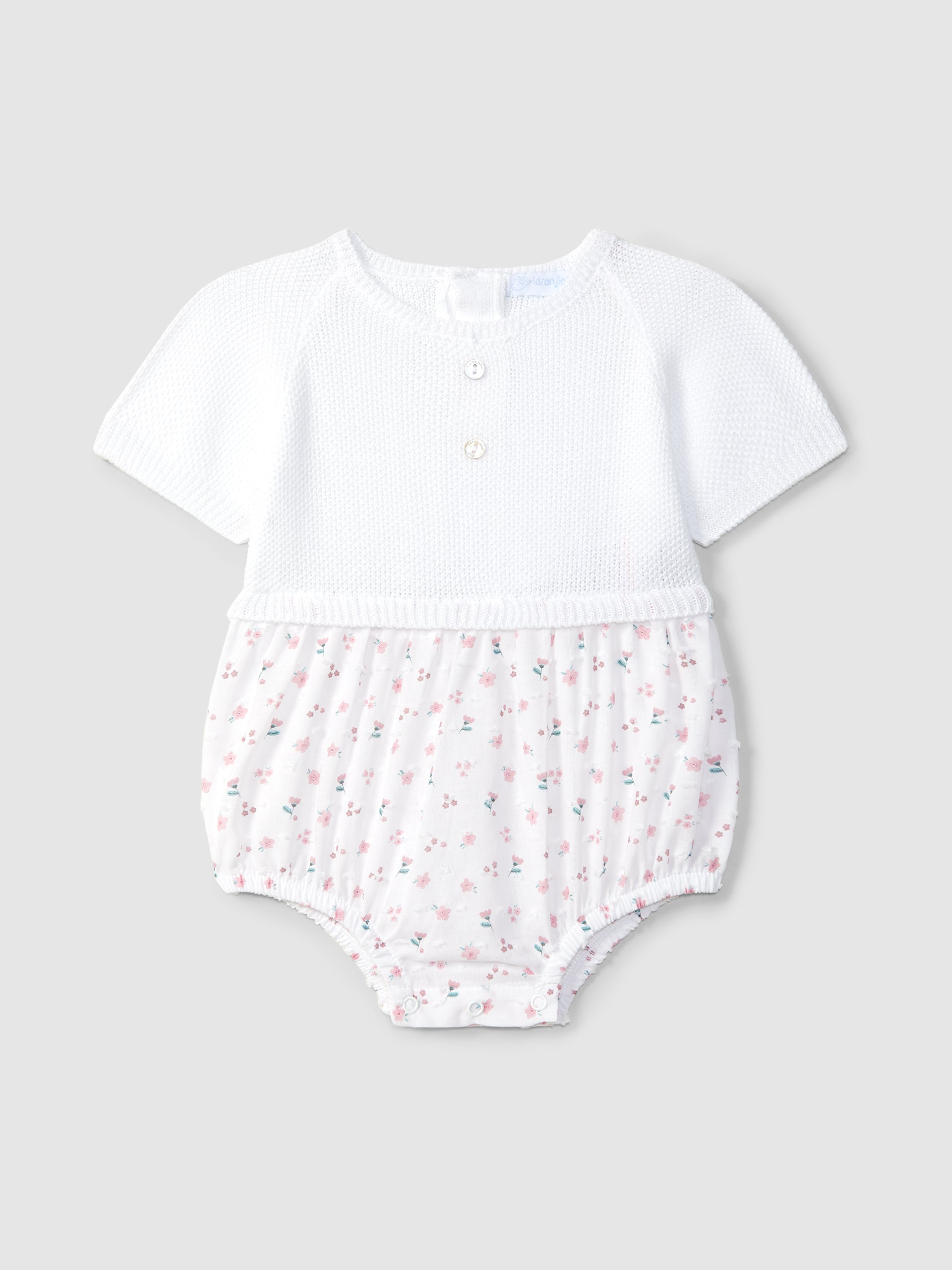 Ranita de tejido estampada, con su parte superior en punto arroz con botones decorativos en el pecho. Parte inferior en tejido estampado.