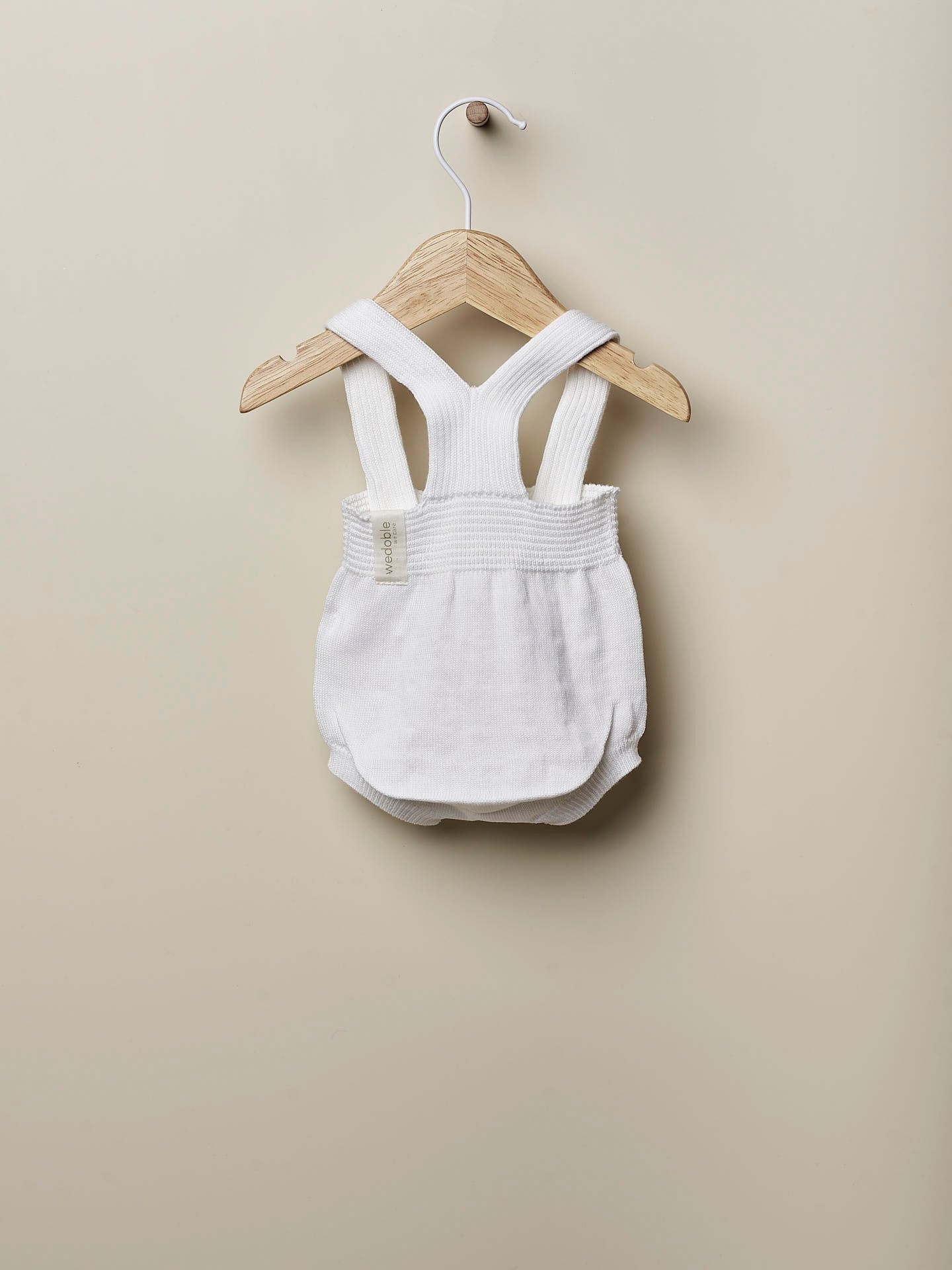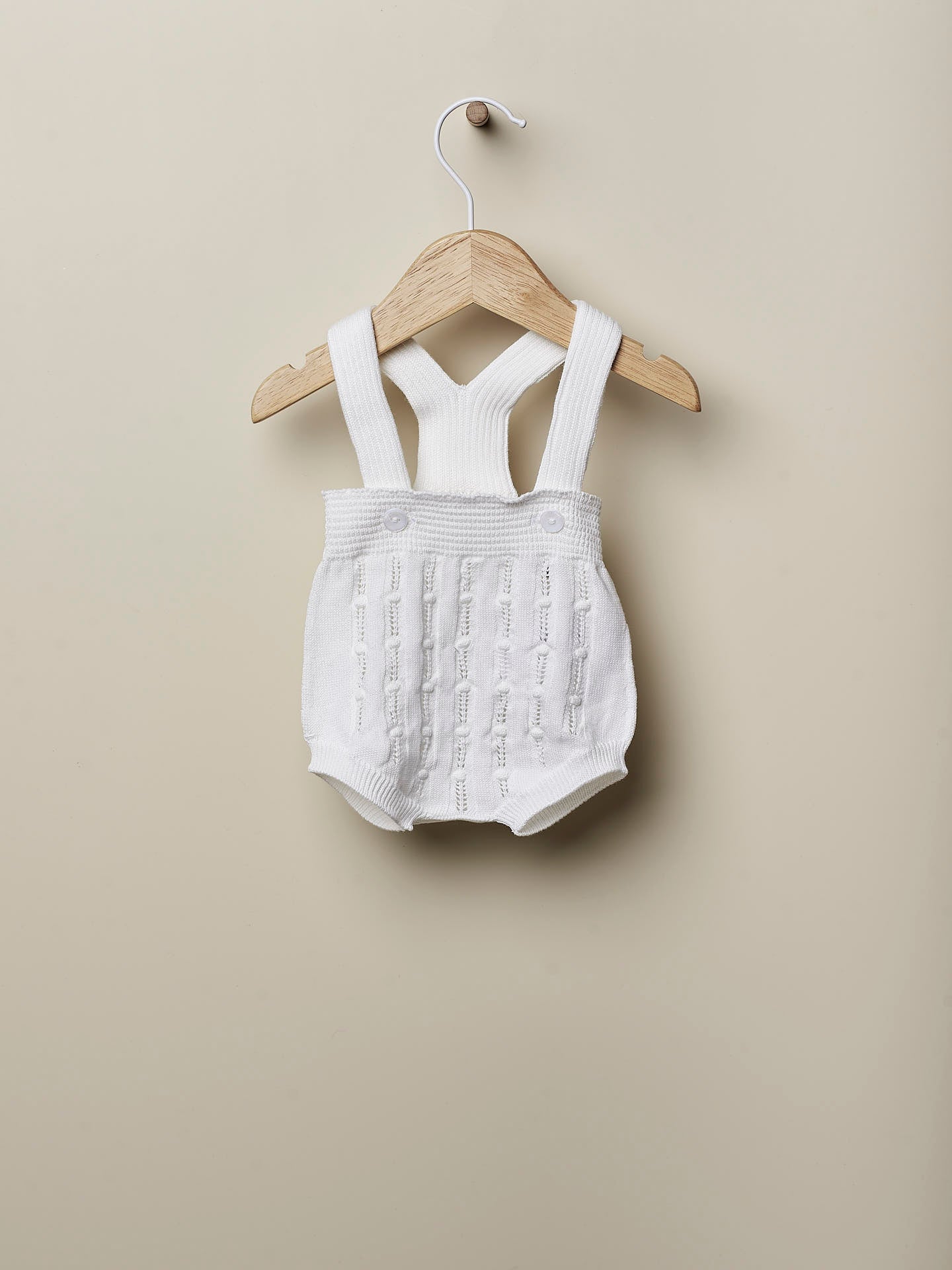 Ranita con tirantes tejido en malla fina de algodón orgánico suave y transpirable, ideal para bebés recién nacidos, niños y niñas. Se abrocha en la parte delantera en los tirantes con botones de nácar. Una sola pieza sin costuras, para el máximo confort de tu bebé.