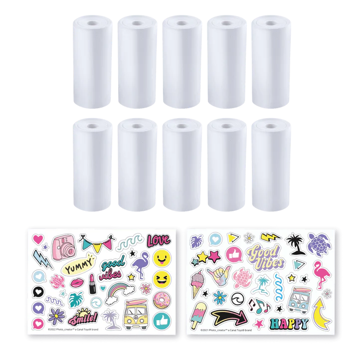 ¡Para aún más diversión, este juego de recambios consta de 10 rollos de papel térmico y 2 hojas de pegatinas, adecuado para su uso con la cámara de impresión instantánea Photo Creator!