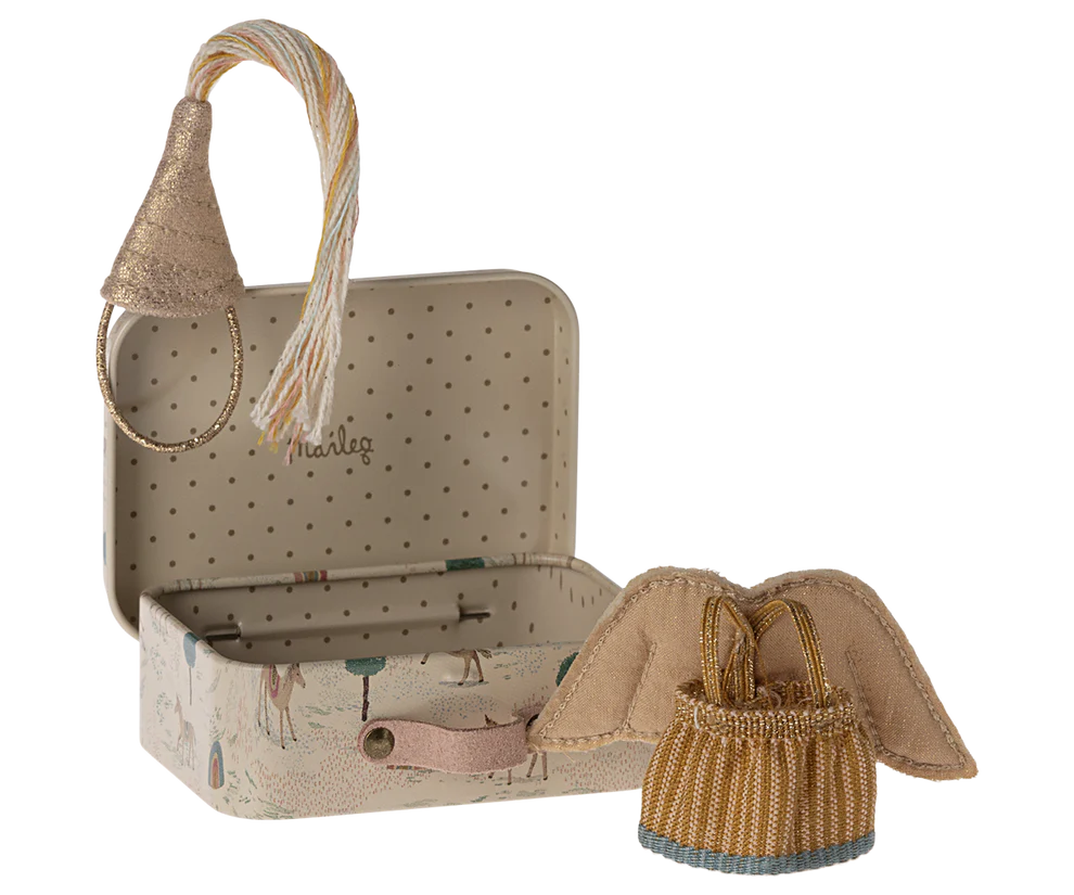 Viste a tu hermanita ratona con este precioso conjunto de ropa de hadas. Este conjunto incluye una falda, alas y un sombrero, todo empaquetado en una pequeña maleta de metal para que sea fácil de llevar mientras viaja.