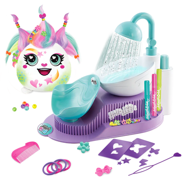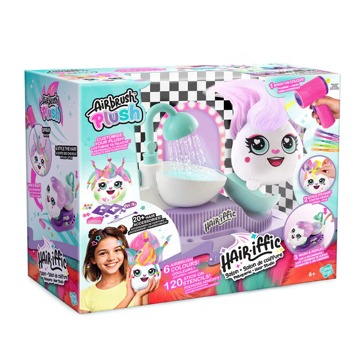 UNA AUTÉNTICA PELUQUERÍA EN CASA: Este set incluye un peluche Airbrush y una peluquería para lavar el pelo del peluche. Basta con llenar el depósito de agua y pulsar el botón para que salga el agua por la alcachofa de la ducha. Se pueden crear muchos peinados con los accesorios incluidos: mini gomas para el pelo, pinzas para el pelo, peine, rotuladores y plantillas adhesivas para decorar y colorear el peluche.