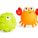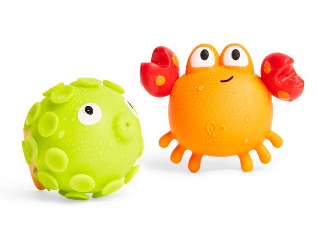 ¡Estos animalitos de agua rocosa esconden un divertido y travieso secreto! Si el peque llena de agua al cangrejo y al pez y después los aprieta... ¡dispararán agua! Son ideales para añadir un toque de alegría y diversión a la hora del baño.