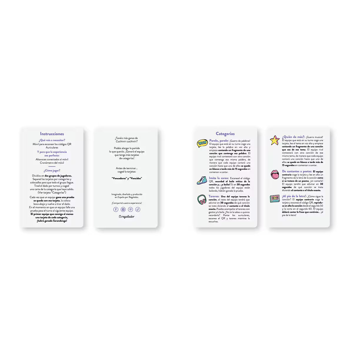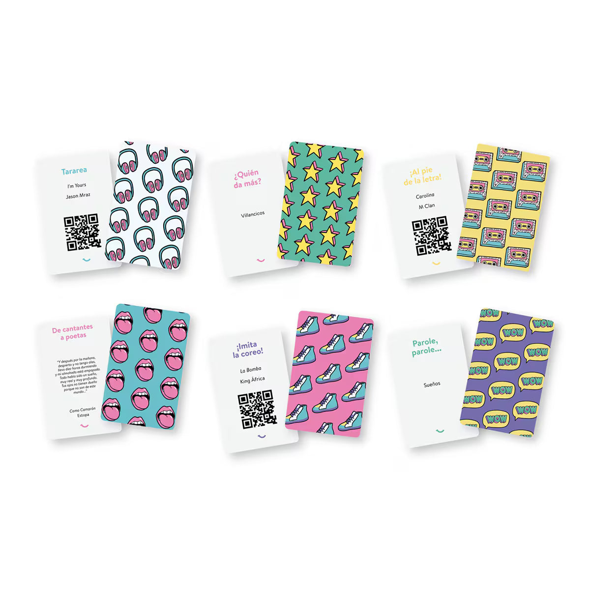 ¿Habrá jugadores de distintas generaciones y gustos musicales? ¡Mucho mejor! En Sarandonga encontraréis desde el Flying Free de Pont Aeri, Danza kuduro de Don Omar, Déjame de Los Secretos o Imagine de John Lennon al famosísimo Malamente de Rosalía. Cada vez que paséis una prueba os quedaréis con la tarjeta. El primer equipo que consiga una tarjeta de cada categoría será el vencedor. ¿Y si nos sabe a poco? Jugad sin límites, hasta que la diversión decaiga... ¡o se acaben las tarjetas!
