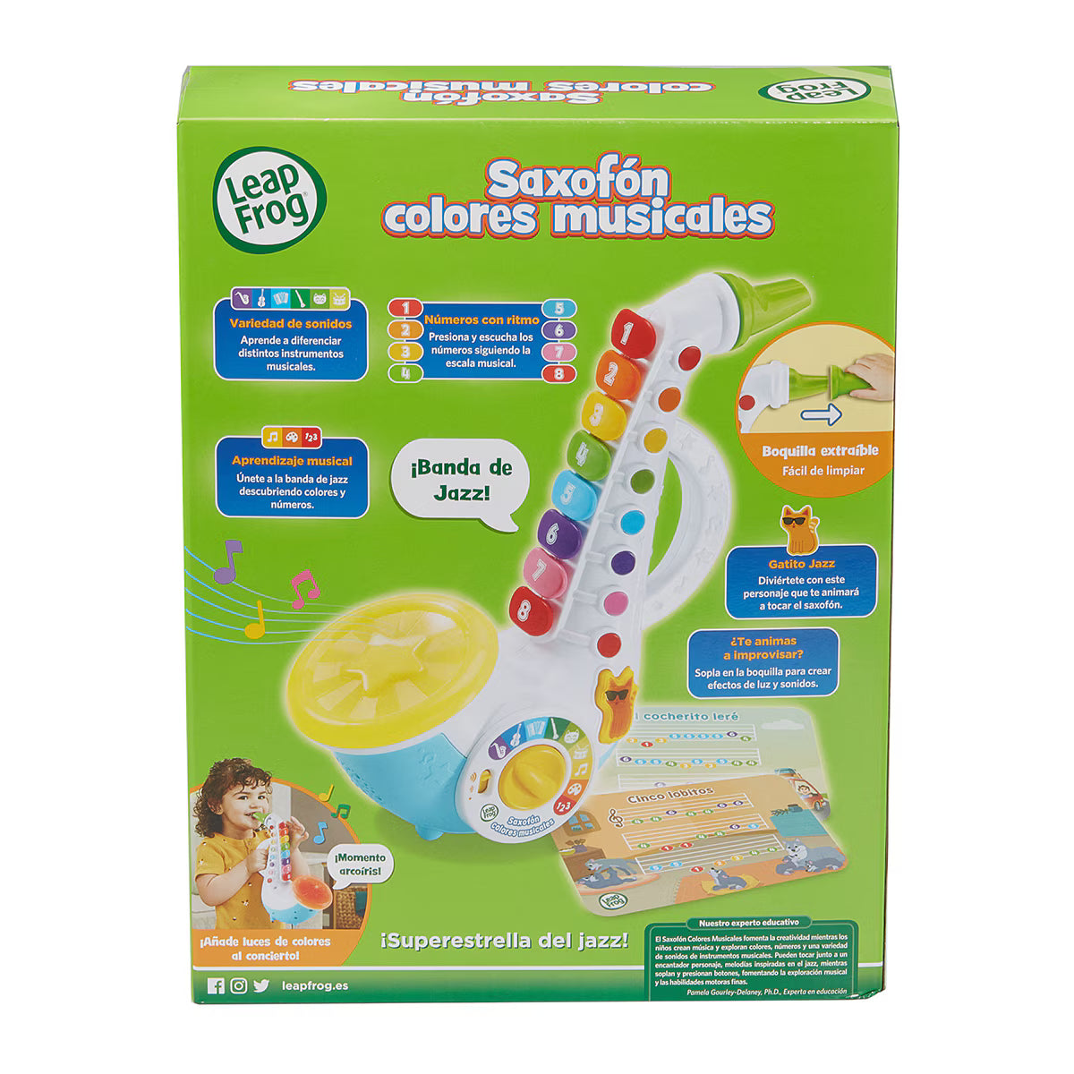 Boquilla extraíble fácil de limpiar. Al soplar escucha divertidos sonidos. 2 tarjetas a doble cara con canciones para aprender a tocar.