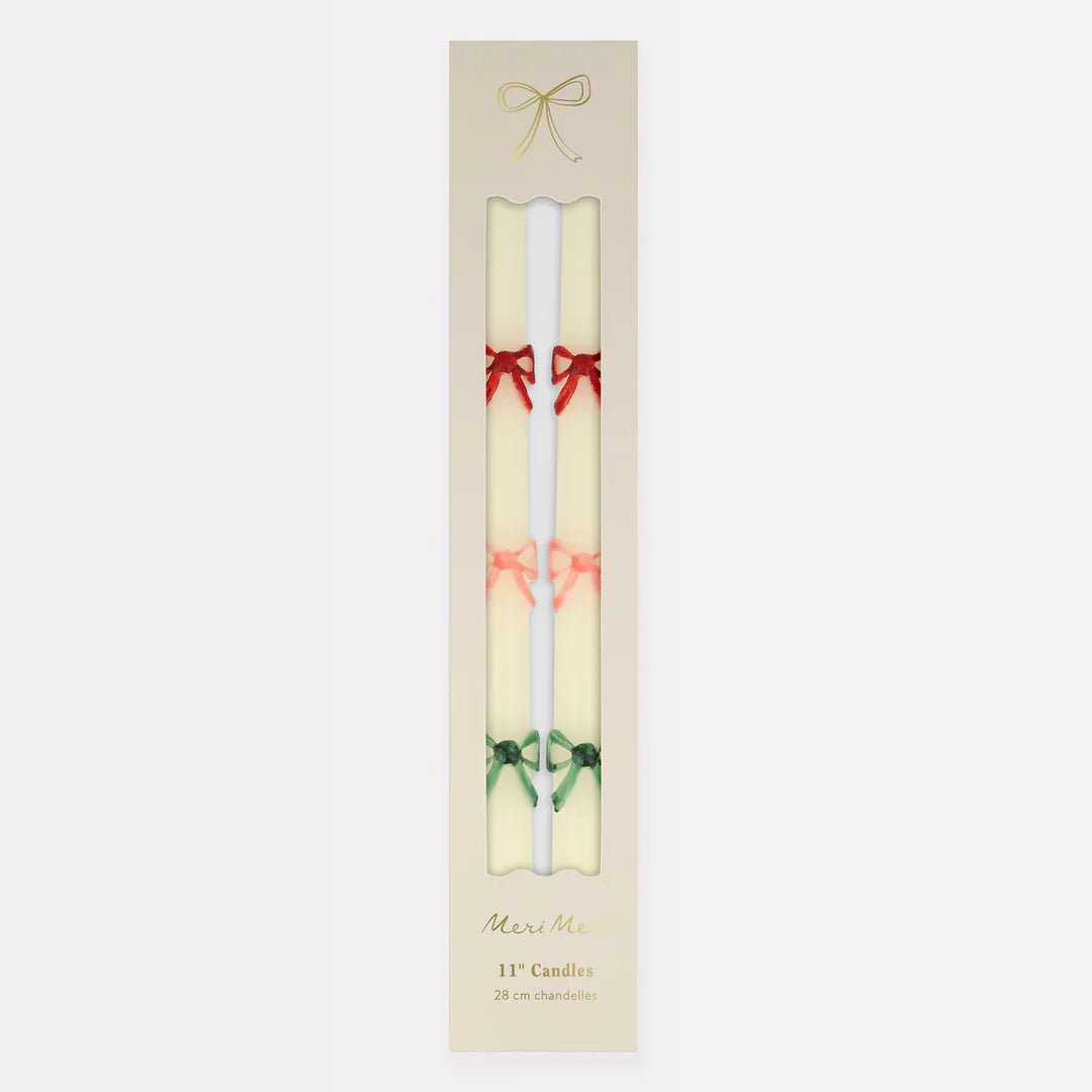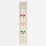 Este set de 2 velas decorativas combina elegancia y tendencia con un delicado diseño de lazo en relieve, pintado a mano en tonos rojo, rosa y verde sobre cera marfil.