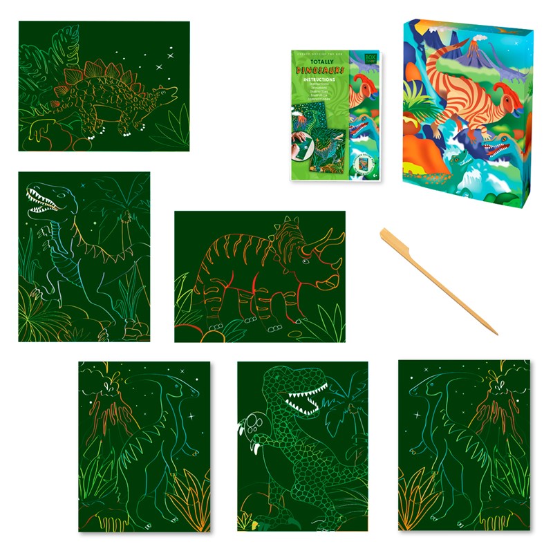 Descubre 6 diferentes dibujos de dinosaurios después de rascar estas láminas y decora tu habitación. Contiene 6 láminas para rascar y la herramienta de rascado. Instrucciones en el interior. |