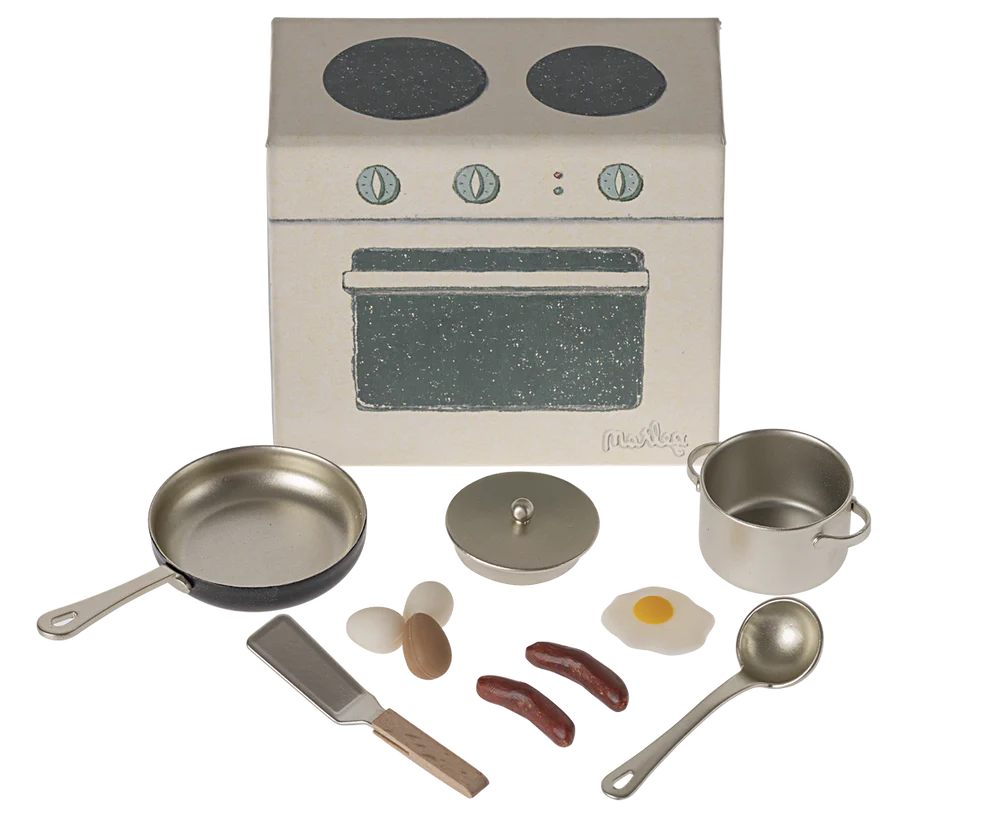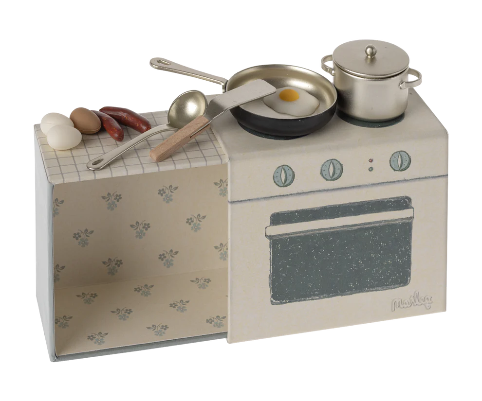 Un pequeño juego de cocina para cualquier ratón. Este set incluye utensilios de cocina, huevos y salchichas para preparar el brunch perfecto. Está empaquetado en una caja de papel decorada como una pequeña cocina para que forme parte del juego y la narración.