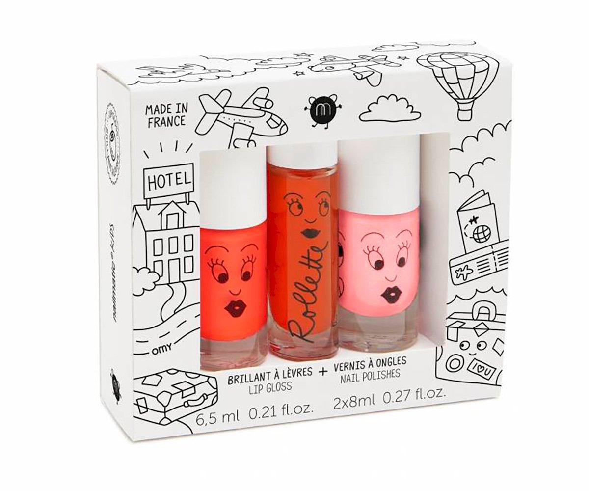 Pack de tres productos que incluye dos esmalte de uñas de color rosa y rojo y un brillo de labios melocotón
