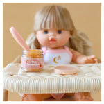 El set incluye una cuchara mágica y un tarro de gelatina de melocotón. La cuchara está especialmente diseñada para introducirla en el tarro, pues incluye comida que desaparece como si tu muñeca se lo hubiera comido.