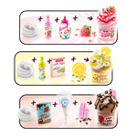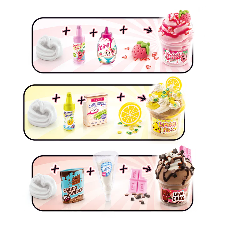 Componentes: -1 Mezclador - 1 Slime - 4 Ollas - 2 botellas de colorante- 2 Polvos marrones - 4 decoraciones - 3 dijes - 1 bolsa de nata montada