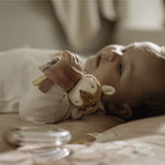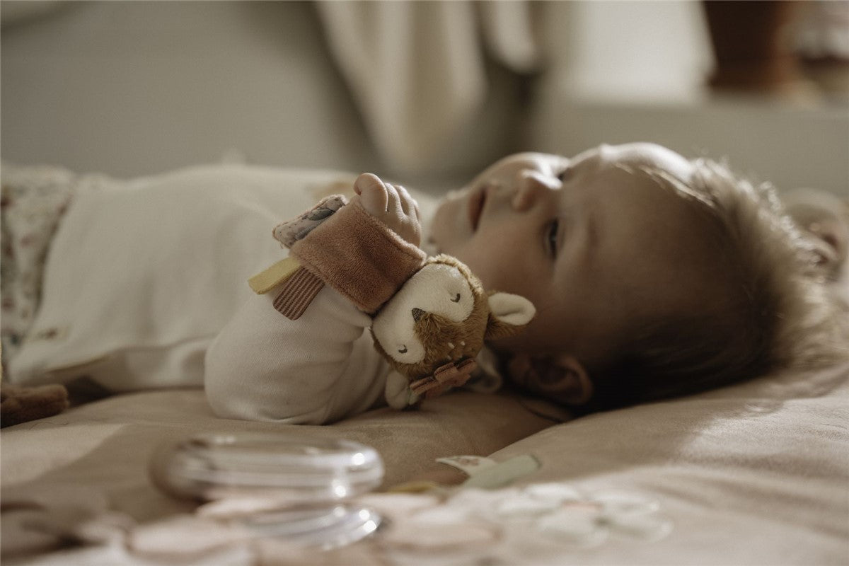 ¡Mueve las manos y sorpréndete! Esta suave pulsera con sonajero entusiasmará a tu bebé. Simplemente colócala en la muñeca de tu pequeño y deja que comience la diversión. ¡El tierno ciervo en la parte superior de la pulsera está listo para moverse! Pero hay más para explorar. Las piezas arrugadas, las etiquetas y un pequeño nudo estimulan el agarre y el tacto. Un maravilloso juguete para un bebé feliz.