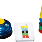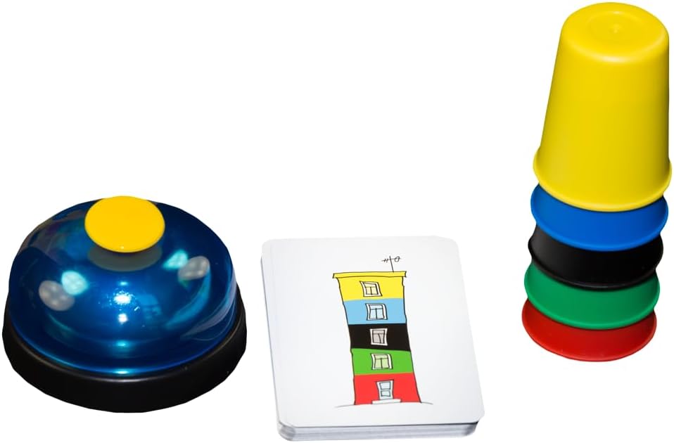 ¿CÓMO SE JUEGA? - Cada jugador tiene cinco cubiletes de colores. Una carta muestra cómo deben apilarse o alinearse según el dibujo. El jugador más rápido en colocar los cubiletes de forma correcta y tocar el timbre se lleva la carta..