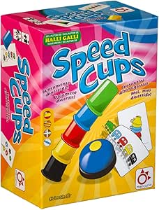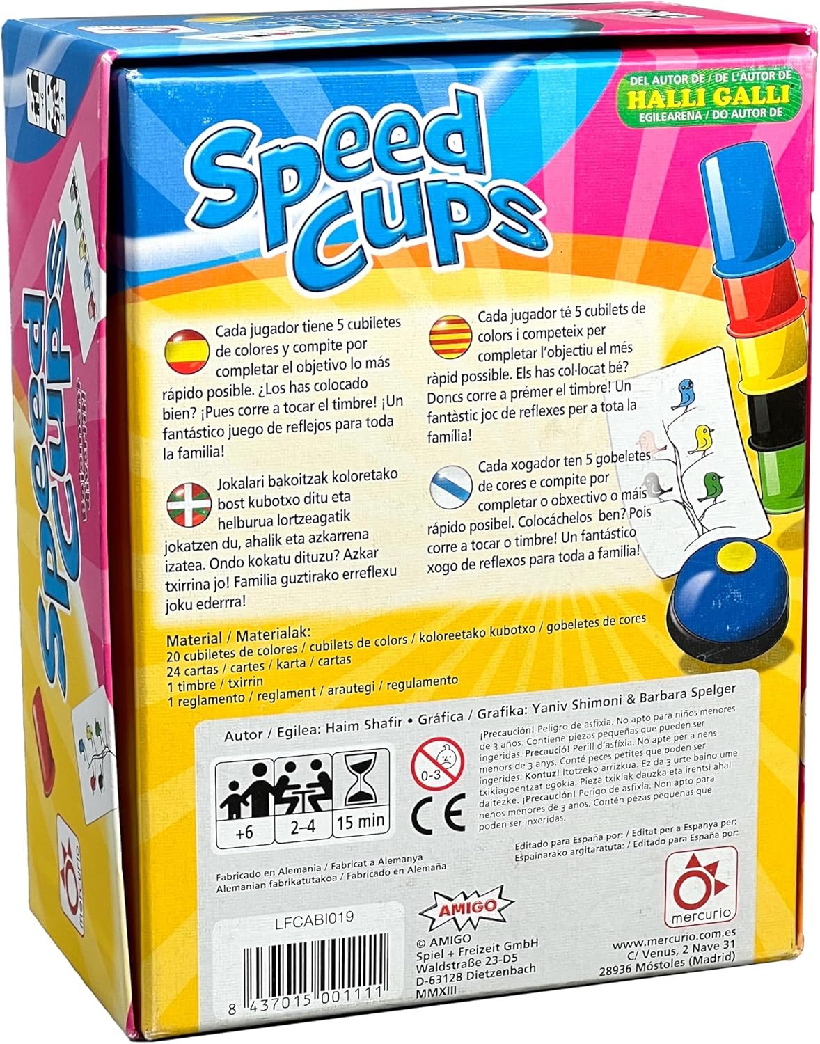 En Speed Cups, los jugadores deben usar cinco cubiletes de colores para replicar la secuencia de una carta lo más rápido posible. Quien toque el timbre primero y lo haga correctamente, gana la ronda..