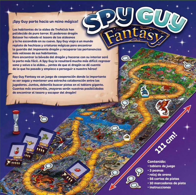 Spy Guy Fantasy es un juego de cooperación donde lo importante, además de ser muy observador, será una estrecha colaboración entre los jugadores. Juntos, deberéis buscar pistas en el tablero gigante, cuantas más encontréis, ¡mayores serán vuestras posibilidades de encontrar el tesoro y, sobre todo, de escapar del dragón!