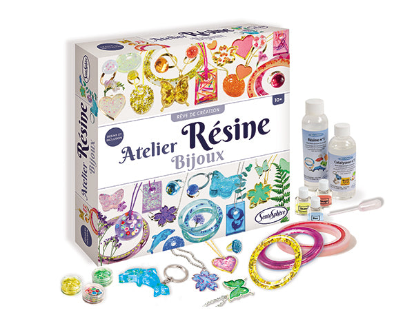 Todo lo que hay que hacer es mezclar resina con un catalizador, eventualmente colorear la preparación y luego verterla en los diferentes moldes y colgantes ofrecidos. Las lentejuelas y las mini frutas propuestas permiten realizar inclusiones para realzar estas futuras piezas de joyería. ¡20 horas más tarde, estas creaciones se pueden desmoldar fácilmente para convertirse en magníficas pulseras, anillos, collares y llaveros!