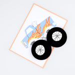 ¡Brum, brum! Cuando este camión monstruo aparezca, ocupará un lugar destacado en cualquier expositor de tarjetas de cumpleaños. La tarjeta decorativa perfecta para un gran aficionado a los vehículos, con ruedas de nido de abeja y un montón de detalles holográficos plateados brillantes. También es ideal para decorar el dormitorio.