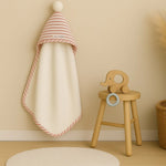 Toalla de suave rizo 100% algodón decorada con un pompón, para el baño de los más pequeños, la piscina o la playa.