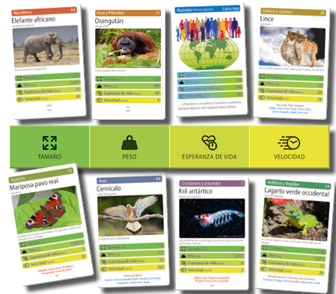 Selecciona hábilmente tus cartas para ganar en las diferentes categorías. El animal más grande y el más pequeño, el que más y menos pesa, esperanza de vida más alta y baja y, por último, el más rápido y el más lento.