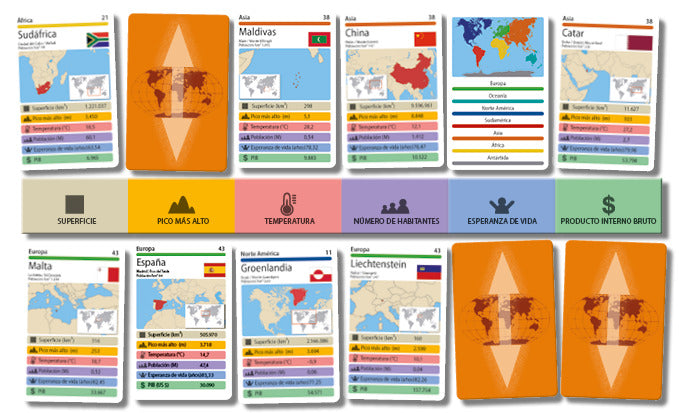 La montaña más alta, la temperatura más baja… ¿Quién ganará la categoría? ¿Quién será capaz de conseguir más puntos seleccionando hábilmente las cartas de su país? ¡El valor más bajo o más alto cuenta