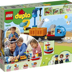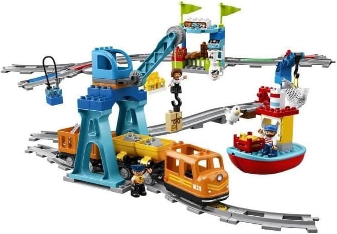 Tu bebé se lo pasará en grande con este increíble set de construcción LEGO DUPLO que cuenta con un tren de mercancías con motor Push&Go, vías para hacer un circuito, grúa de juguete, barco y puesto de cafetería.