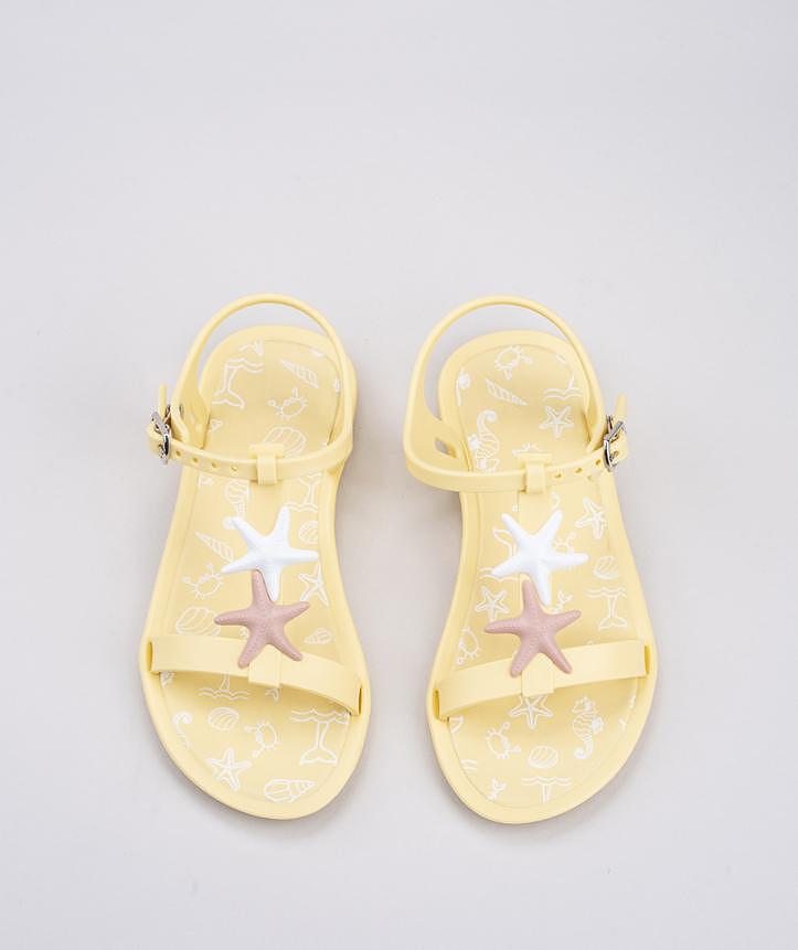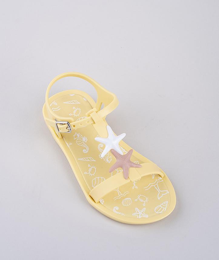 Sandalia abierta en color vainilla, con detalle de estrellas en color blanco y maquillaje y cierre de hebilla.