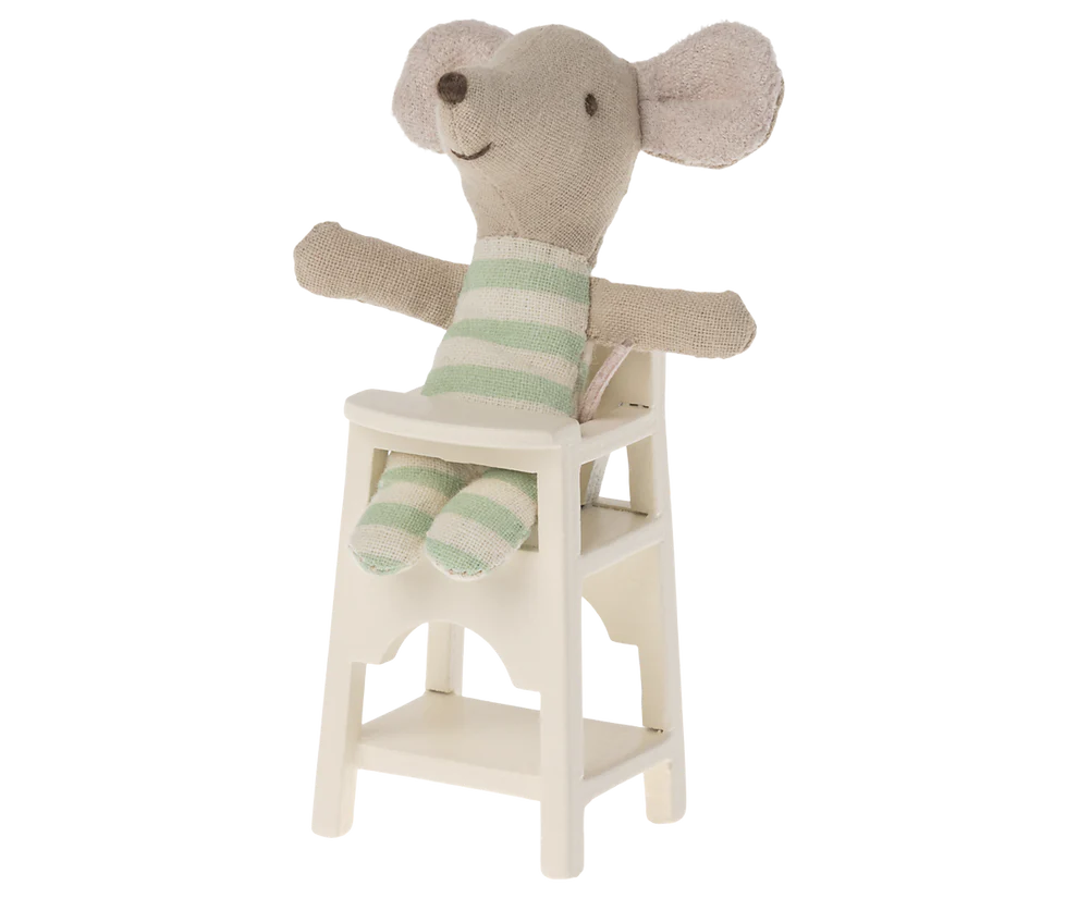 Un complemento clásico de Maileg. Esta trona es imprescindible para todas las familias con bebés para que el pequeño pueda participar en las comidas. Se adapta a ratones bebés.