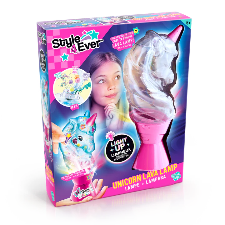 CONTIENE: 1 lámpara de lava Unicornio para crear, 1 bolsa de cuentas, 1 bolsa de piedras, 1 bolsa de decoraciones, 1 frasco de colorante, 1 hoja de pegatinas, 1 set de instrucciones.