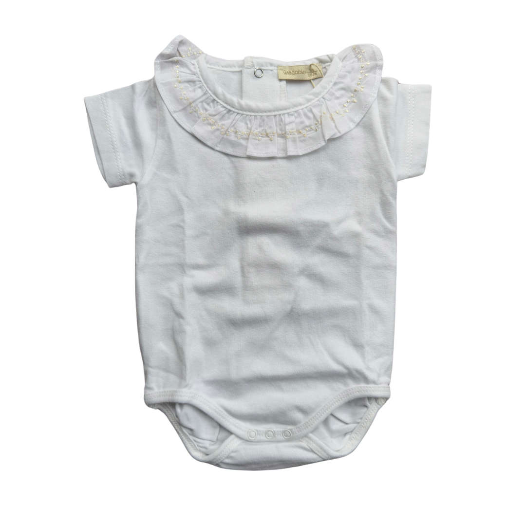 Body clásico de manga corta ideal para bebés niños y niñas. El body de manga corta con volantes está confeccionado en punto blanco de algodón ligero y tiene cuello con volantes bordado. Se cierra con automáticos en la espalda y entre las piernas. El bordado está disponible en diferentes colores.