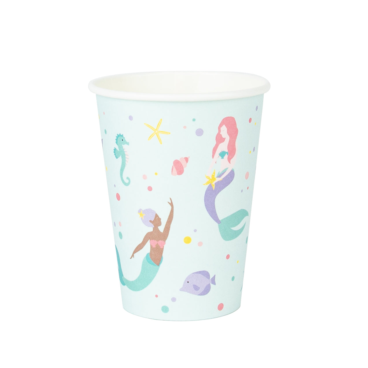 Set de 8 vasos de papel con un original estampado de sirenas. ¡Ideal para montar una fiesta preciosa! Dale un toque único y especial a tus fiestas.