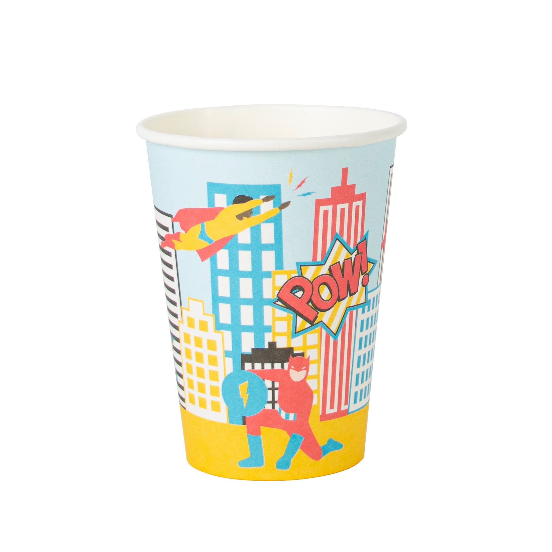 Set de 8 vasos de papel con un original estampado de superhéroes. ¡Ideal para montar una fiesta preciosa! Dale un toque único y especial a tus fiestas.