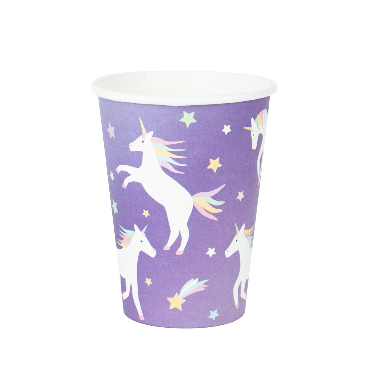 Set de 8 vasos de papel con un original estampado de unicornios. ¡Ideal para montar una fiesta preciosa! Dale un toque único y especial a tus fiestas.