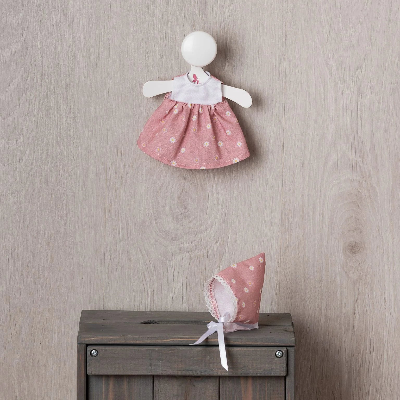 Este vestido para muñeco de 20 cm viene presentado con una percha de cartón.