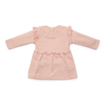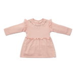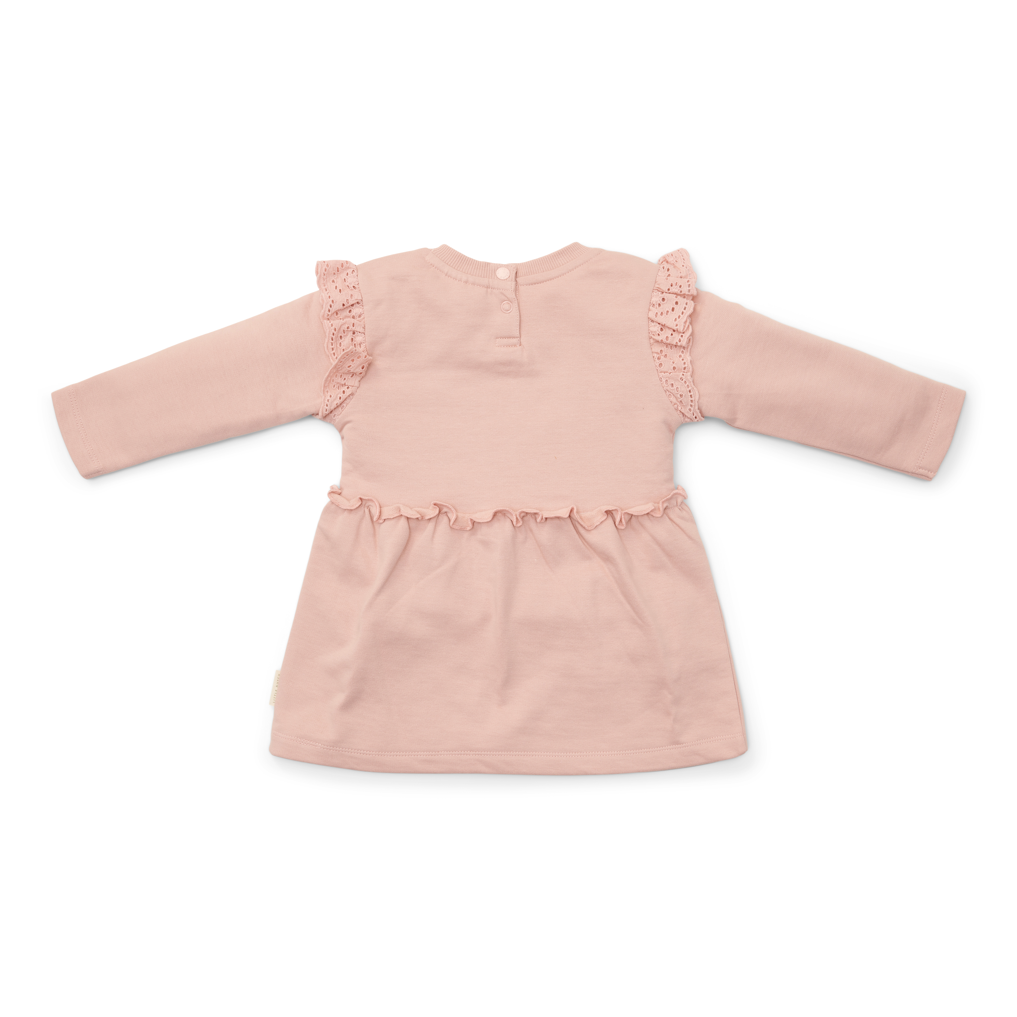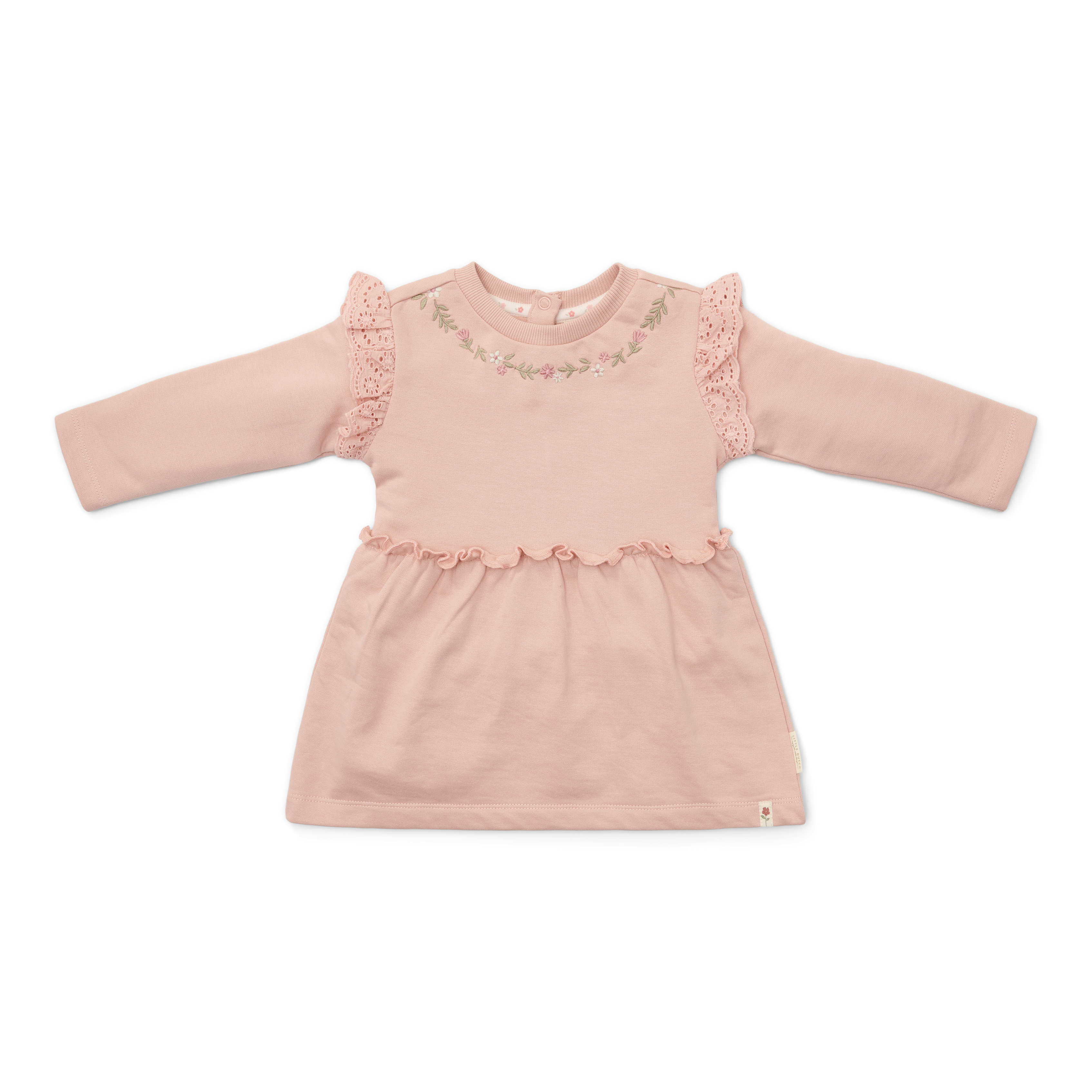 Volantes en los hombros, volantes en la cintura y flores bordadas a lo largo del escote.