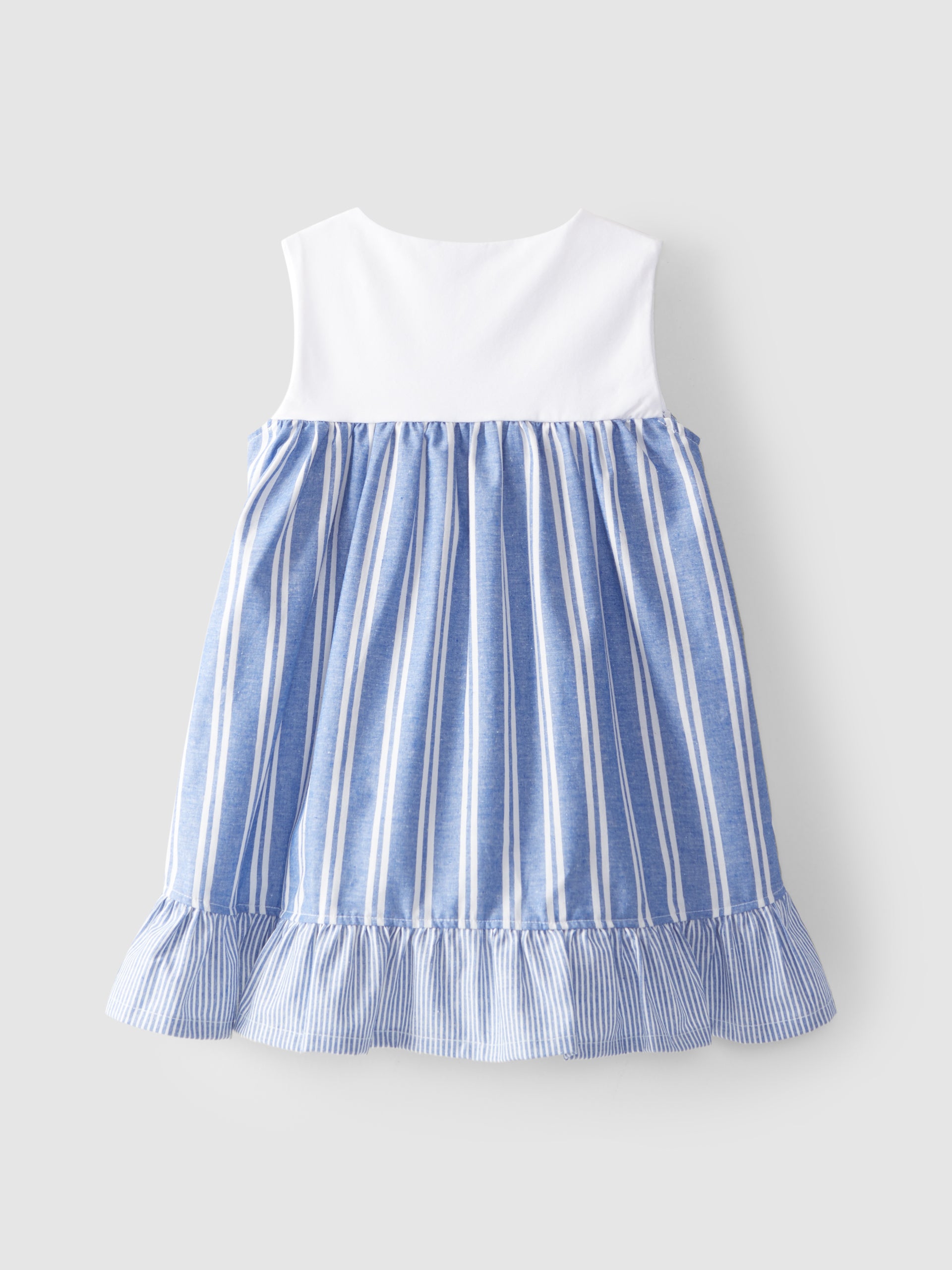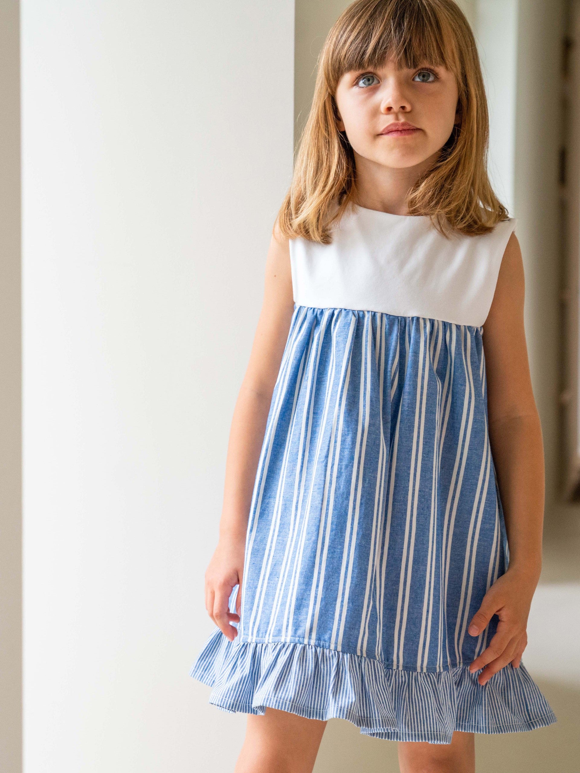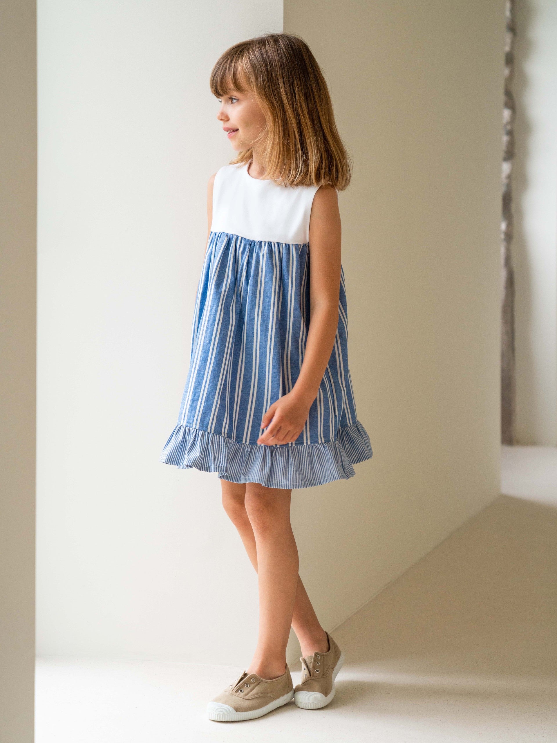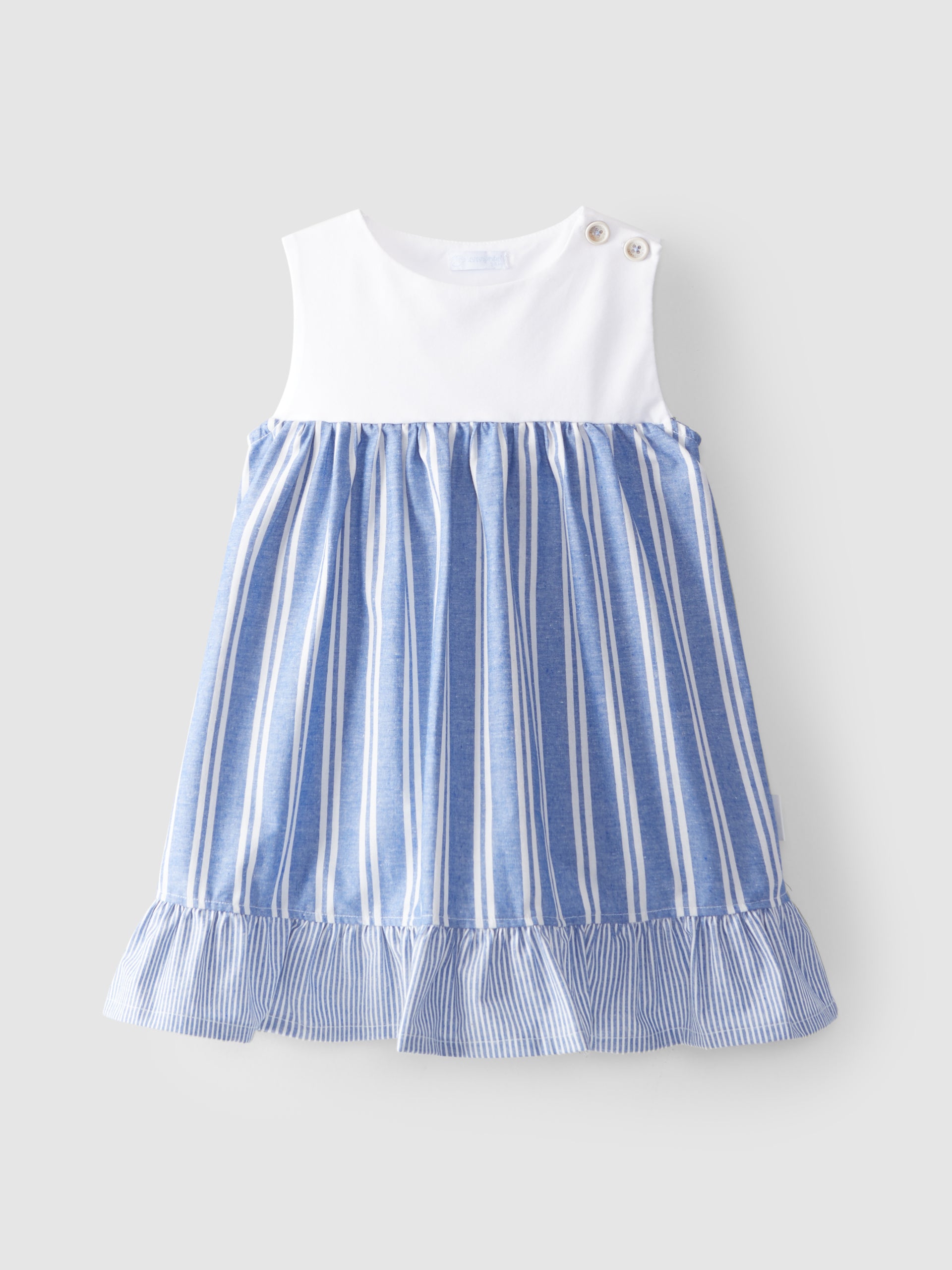 Vestido en algodón orgánico y reciclado. Parte superior de punto para mayor comodidad y parte inferior de tela a rayas con volante en la parte inferior. Se abrocha con botones en el hombro.