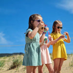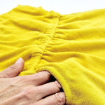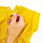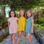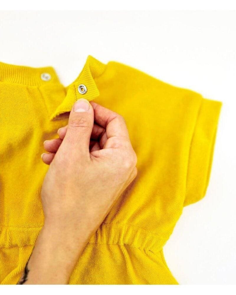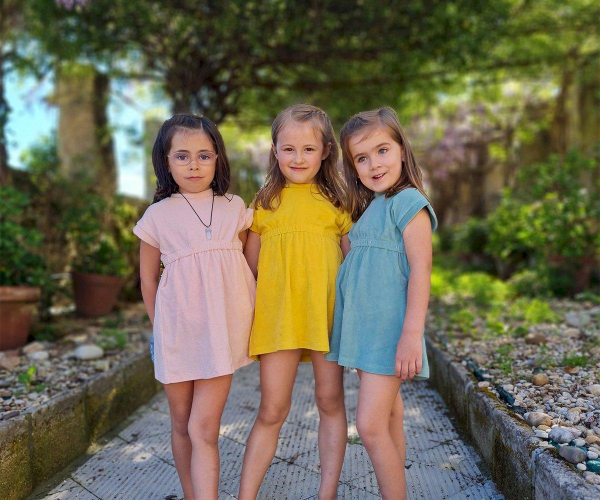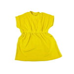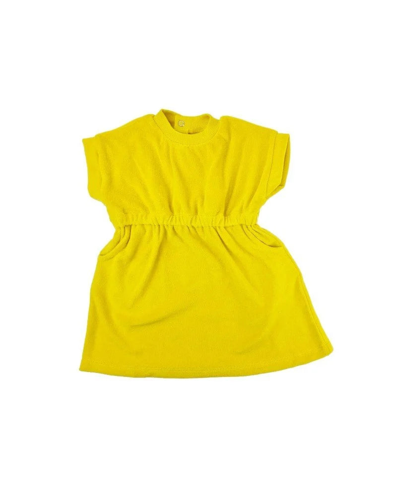 Este vestido infantil está confeccionado en rizo suave de algodón orgánico y poliéster reciclado. Su escote redondo, cinturilla elástica y dos bolsillos pequeños, hacen este vestido cómodo y fresquito.