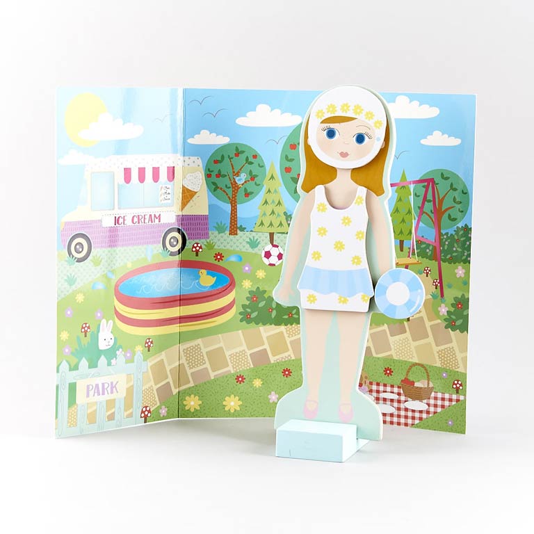 También tiene muchos accesorios para cada disfraz, su peluche, su bolso de mano y el anillo de goma. Todas las piezas son de madera y son magnéticas. En la caja también hay un fondo desplegable con una escena del dormitorio a un lado y al aire libre en el reverso.