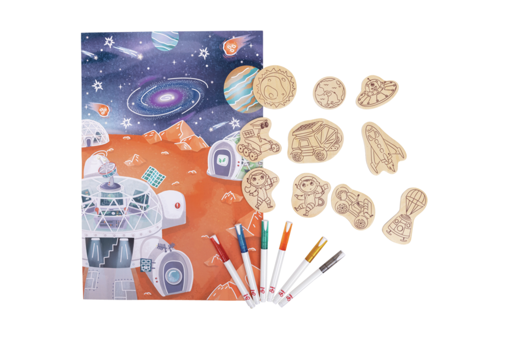 Ideal para animar a los niños a crear su propio mundo imaginario coloreando y contando historias. Decora los imanes de madera y el increíble póster de fondo con los rotuladores de purpurina, luego inventa historias fantásticas basadas en las imágenes y ¡juega en la pizarra!