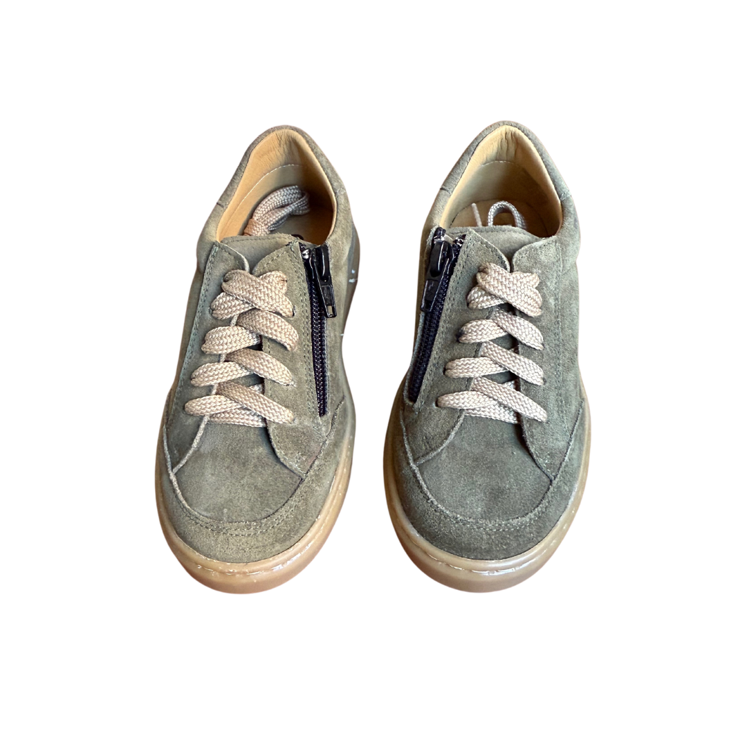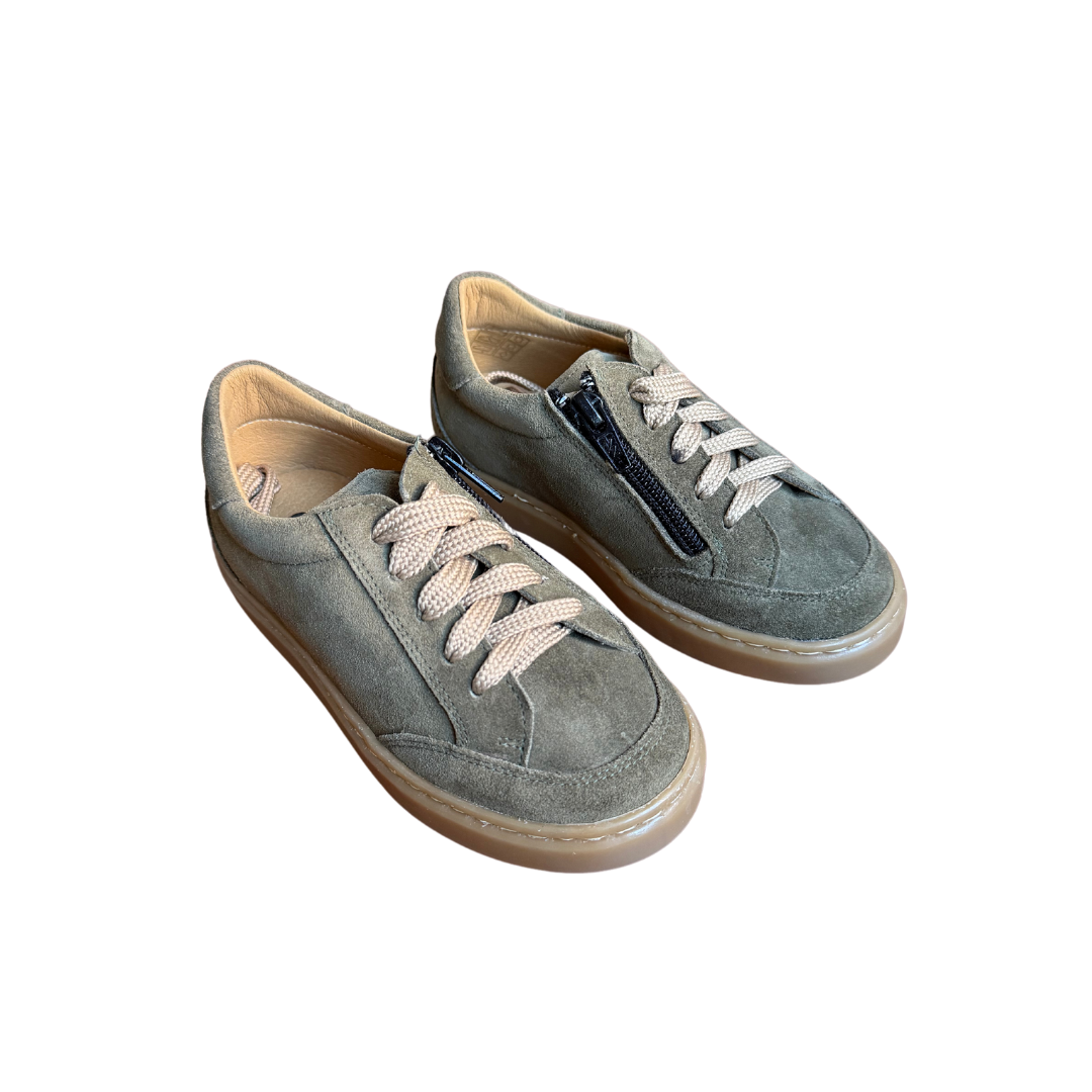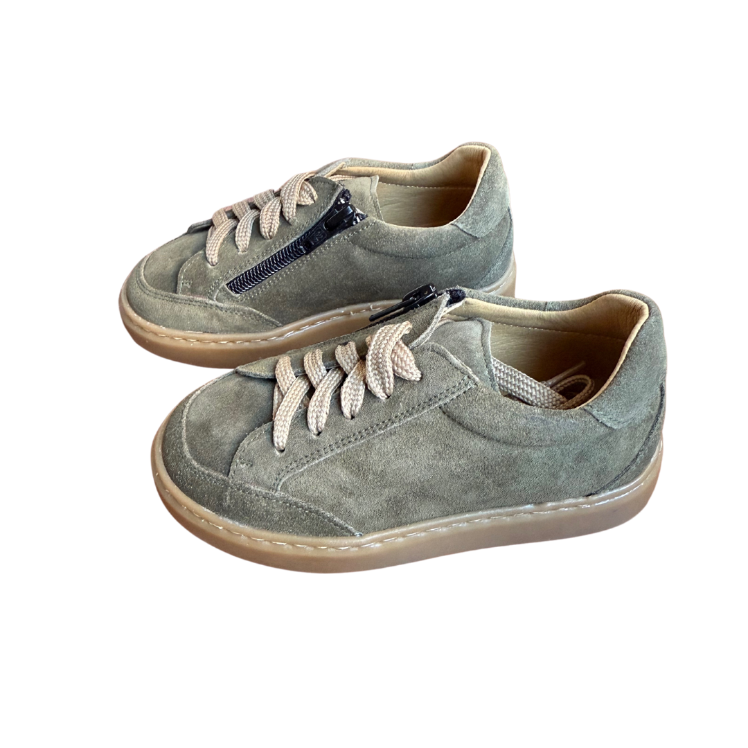 Zapatillas deportivas de ante verde kaki. Cierre mediante cremallera que fomenta la autonomía y facilita el calce de los más pequeños. Ligeras y cómodas gracias a la suela dentada antideslizante.