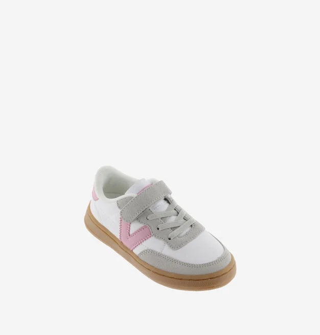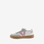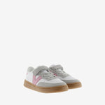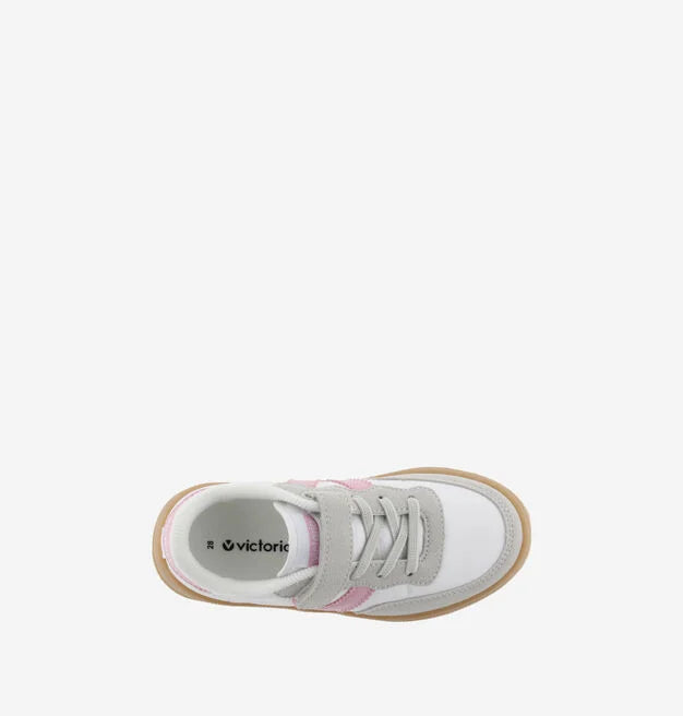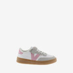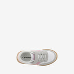 Zapatillas deportivas blancas para niños fabricadas en material efecto piel y piezas de efecto serraje, para un estilo duradero y moderno. Detalle de color en la V del lateral y en la pieza trasera. Cierre mediante cordones elásticos y una tira adhesiva para un ajuste cómodo y fácil de poner. La suela en color caramelo añade un toque único completando el diseño juvenil y versátil de estas zapatillas.