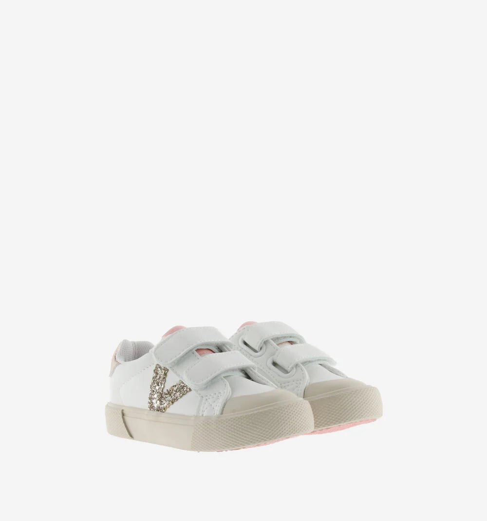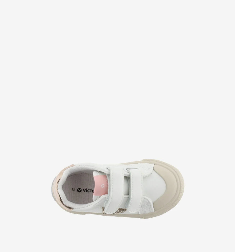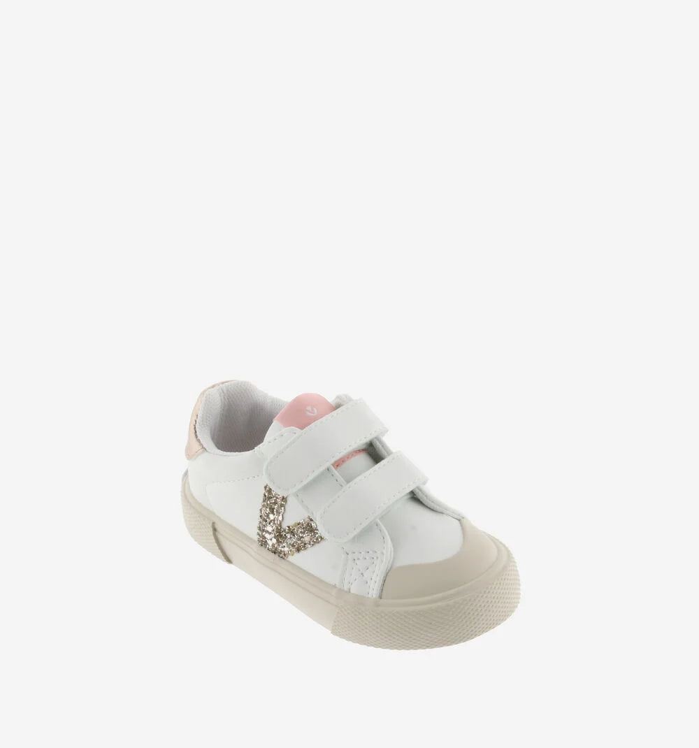 Zapatillas deportivas para niñas con la V en el lateral en glitter con textura y pieza trasera metalizada. Etiqueta rosa en la lengüeta con el logo. Cierre mediante dos tiras adherentes para una mejor sujeción y facilitar el calce. Suela ligeramente tostada y refuerzo de goma en la puntera que las hace más resistentes y duraderas. Llevan plantilla de alta densidad para un mayor confort.